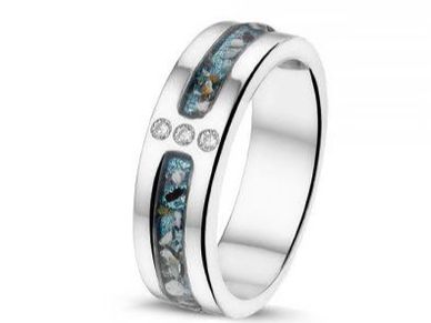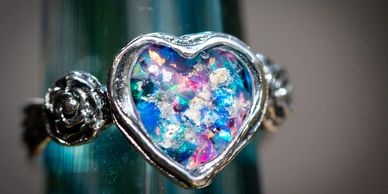 This beautiful sterling silver heart ring has been filled with crushed synthetic opal and infused with cremation ash of your loved one, making it a lovely way to keep them close to your heart.