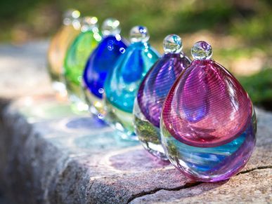 This beautiful handmade glass keepsake urn is made to order by Mike. It holds approximately half a cup of cremains. Due to the nature of handmade glasswork, no two pieces will be alike; the urn you purchase will be unique to you. This piece comes with a glass stopper (black is no longer available). This piece is offered in several color variants.