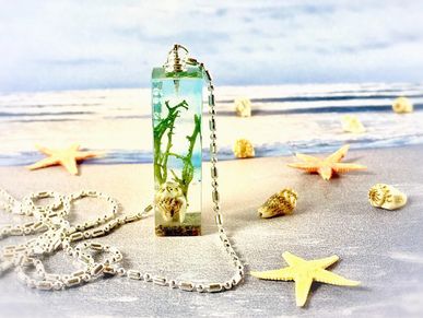 This stunning ocean-themed pendant has been infused with the cremation ash of your loved one, making it a beautiful way to keep them close to your heart. This pendant holds real seaweed, a shell, and sand, with the cremains combined with the sand. Please note that the bail style may differ from what is pictured.