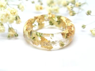 This beautiful crystal resin ring holds real flower blooms with gold flakes. It is infused with the cremains of your loved one, making it a lovely way to keep them close to you.