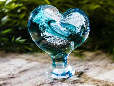 This beautiful solid glass standing heart is infused with cremation ash from your loved one, making it a lovely way to remember and celebrate their life. The cremains are mixed into the glass while molten, along with 2 colors of your choice (please specify in order notes). This piece looks simply stunning in any sunny spot, as the sun refracts through the color glass elements. Pictured is the gold ruby and purple version along with the teal and turquoise version.