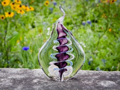 This stunning glass memorial flame has been infused with cremation ash from two of your loved ones, making it a beautiful and elegant way to keep them close to your heart. The cremains are visible in two discreet spirals around the colorful inner core; the solid glass encasement protects the ash forever. Each spiral contains ash from a different person, making this a wonderful way to remember two people who loved each other. For display, we recommend purchasing one of our optional light stands to create a memorial nightlight, or attaching an engraved base to the bottom of the flame.