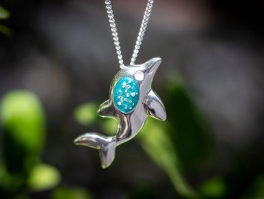 This lovely Silver Dolphin Pendant is made with .925 sterling silver and cremation ash. It is a beautiful and unique way to honor your loved ones. We mix mica bearing crystal resin with cremation ash into the recess. Pictured in Mint