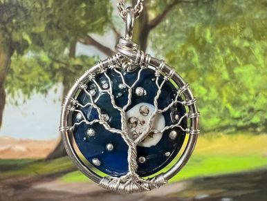 This beautiful pendant has been infused with the cremation ash of your loved one, making it a beautiful way to keep them close to your heart. A beautiful sterling silver tree stands against a starry night and full moon, this piece seems to glow with a beautiful iridescence and sense of peace. The frame is made of heavy gauge sterling silver, and the glass bead holds a special silvered glass with fine silver stars. Pictured is the blue variation. The cremains are visible on the back of the pendant. Due to this item being handmade, no two pendants are exactly the same.